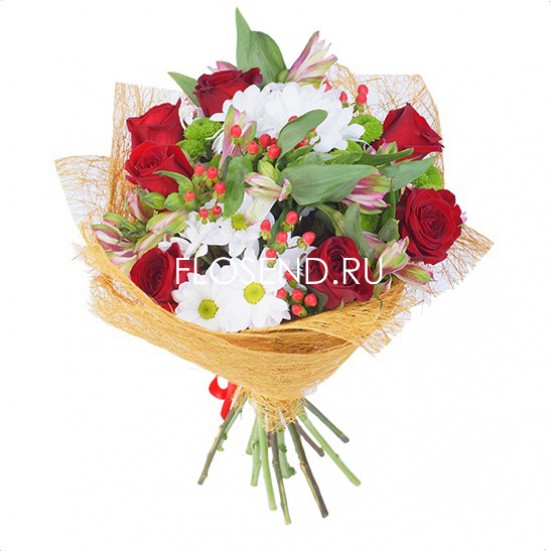Букет из белых хризантем и красных роз